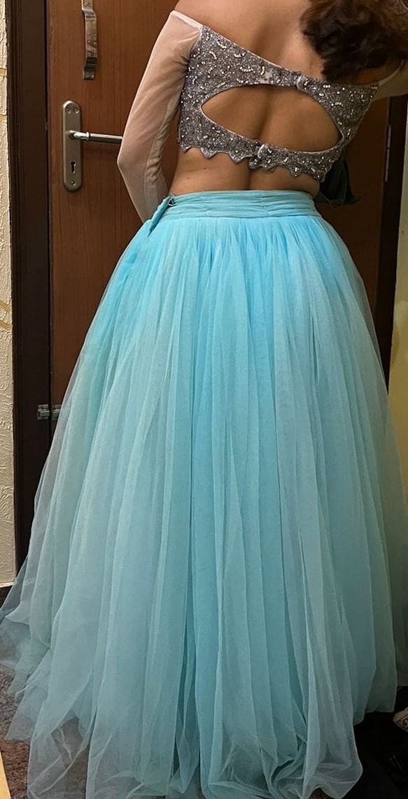 Blue colour netted lehenga and a off shoulder blouse with heavy embroidery. This can be worn for wedding functions, shoots etc.