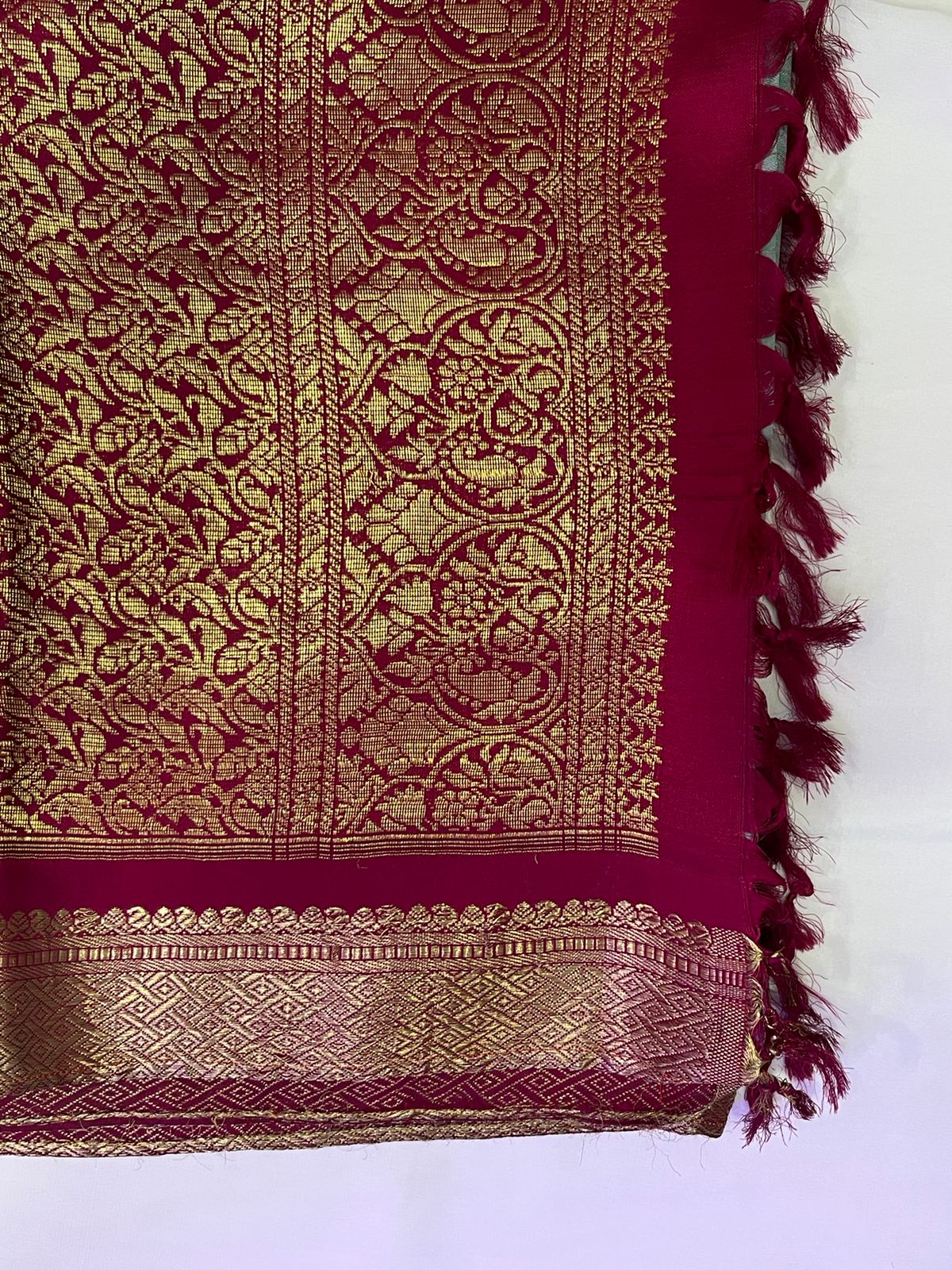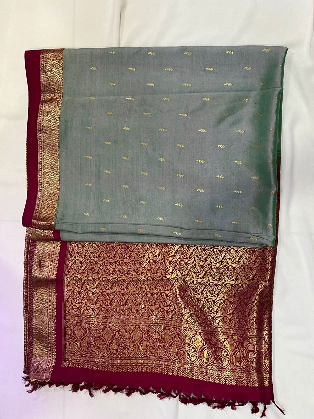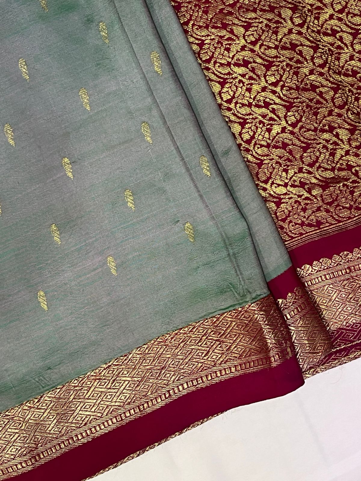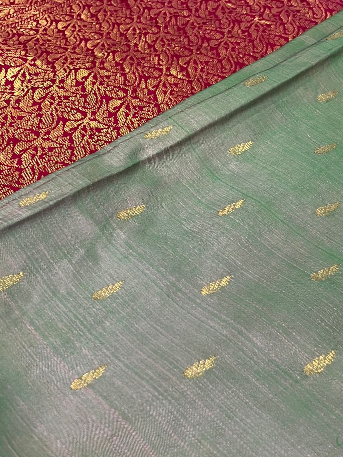 Zari silk lehenga with heavy border in blue colour and a round neck blouse with puff sleeves and a peach colour embroidery dupatta . This can be worn for wedding functions, shoots etc.
