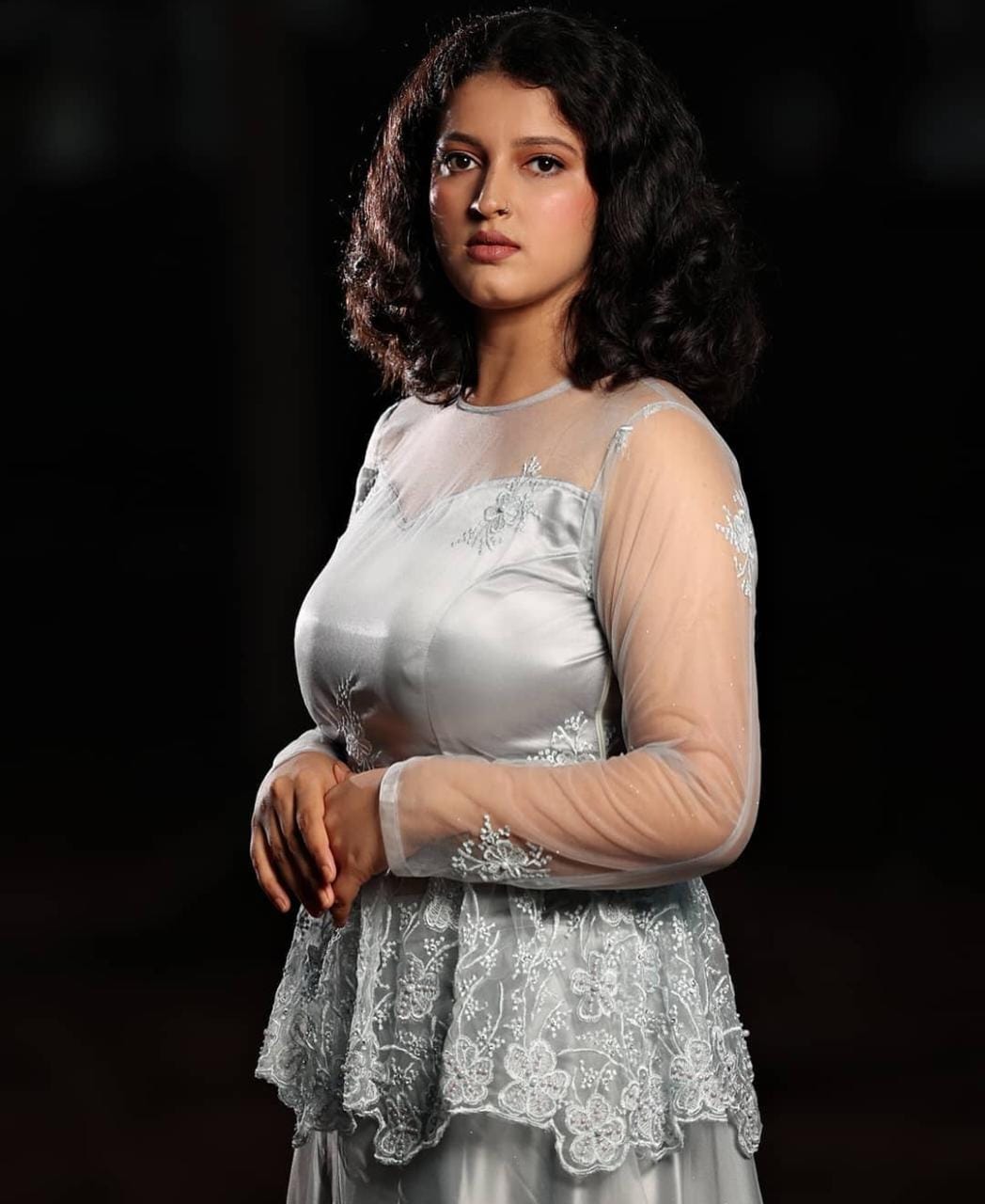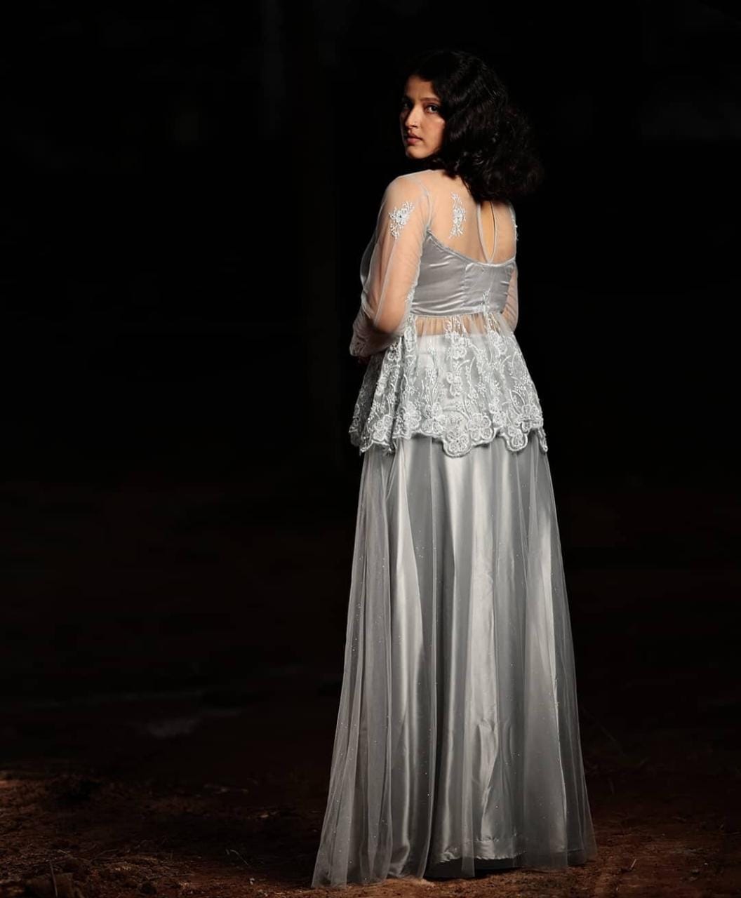 Silver colour net lehenga with a paplum blouse. This can be worn for wedding functions, shoots etc.