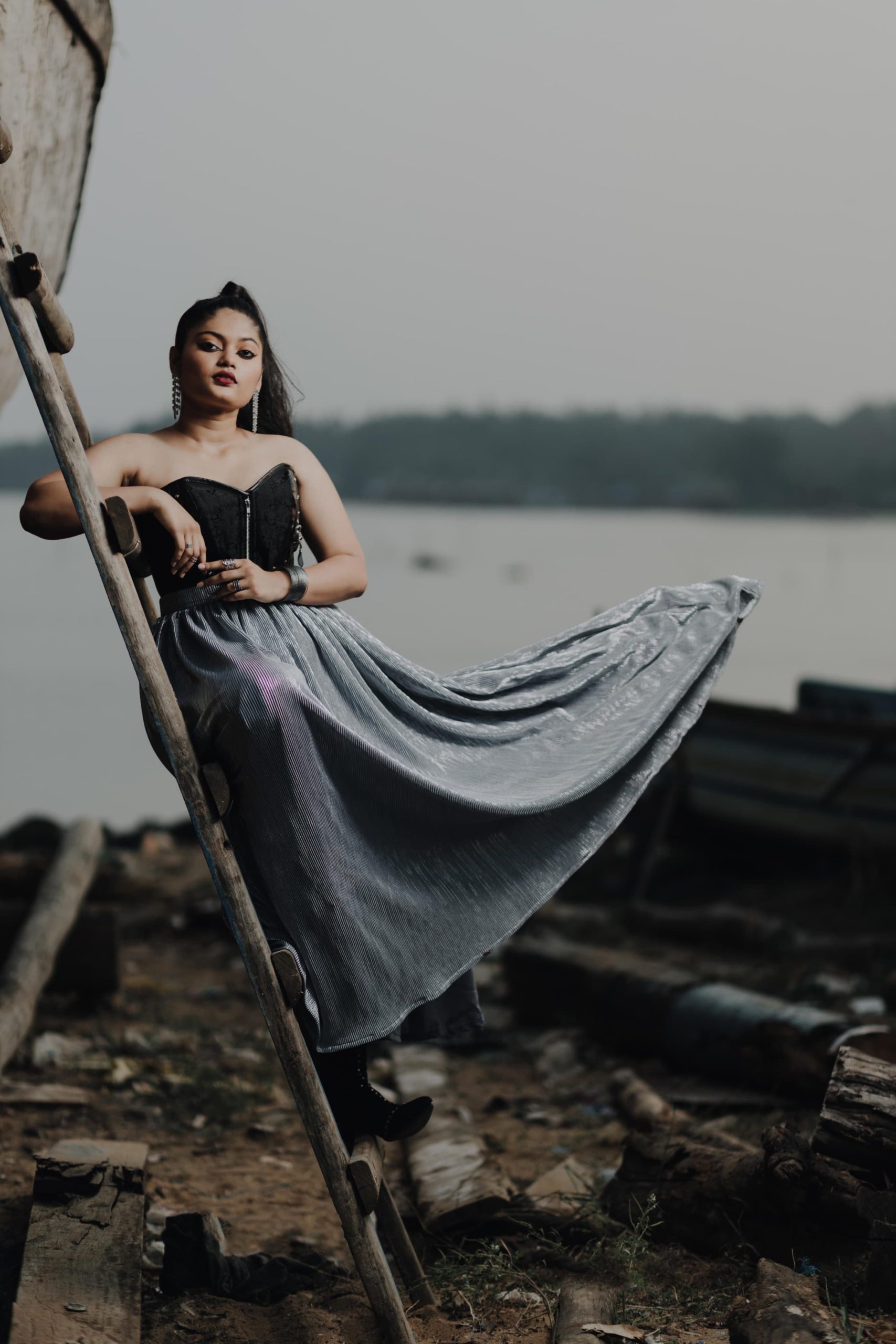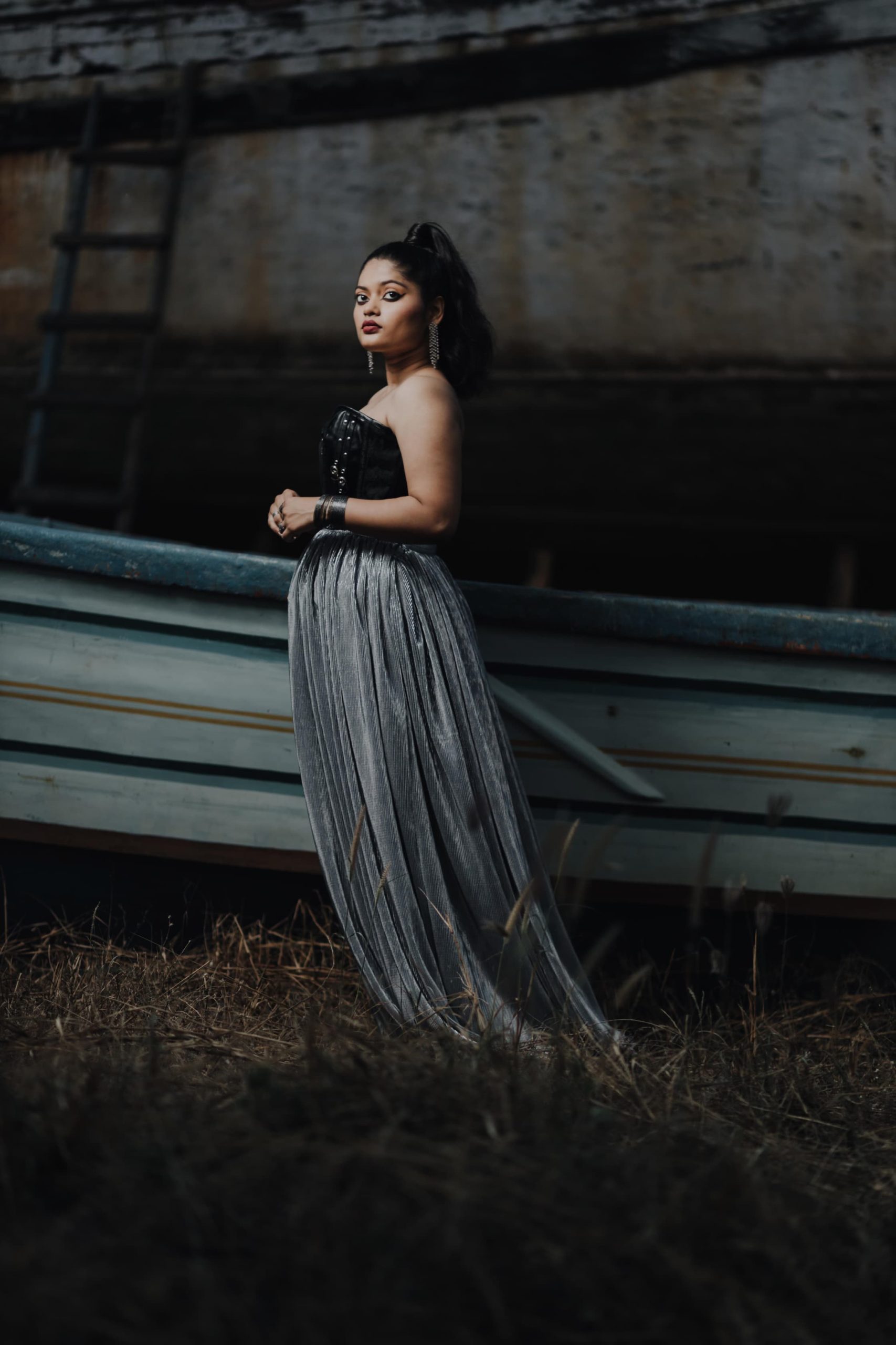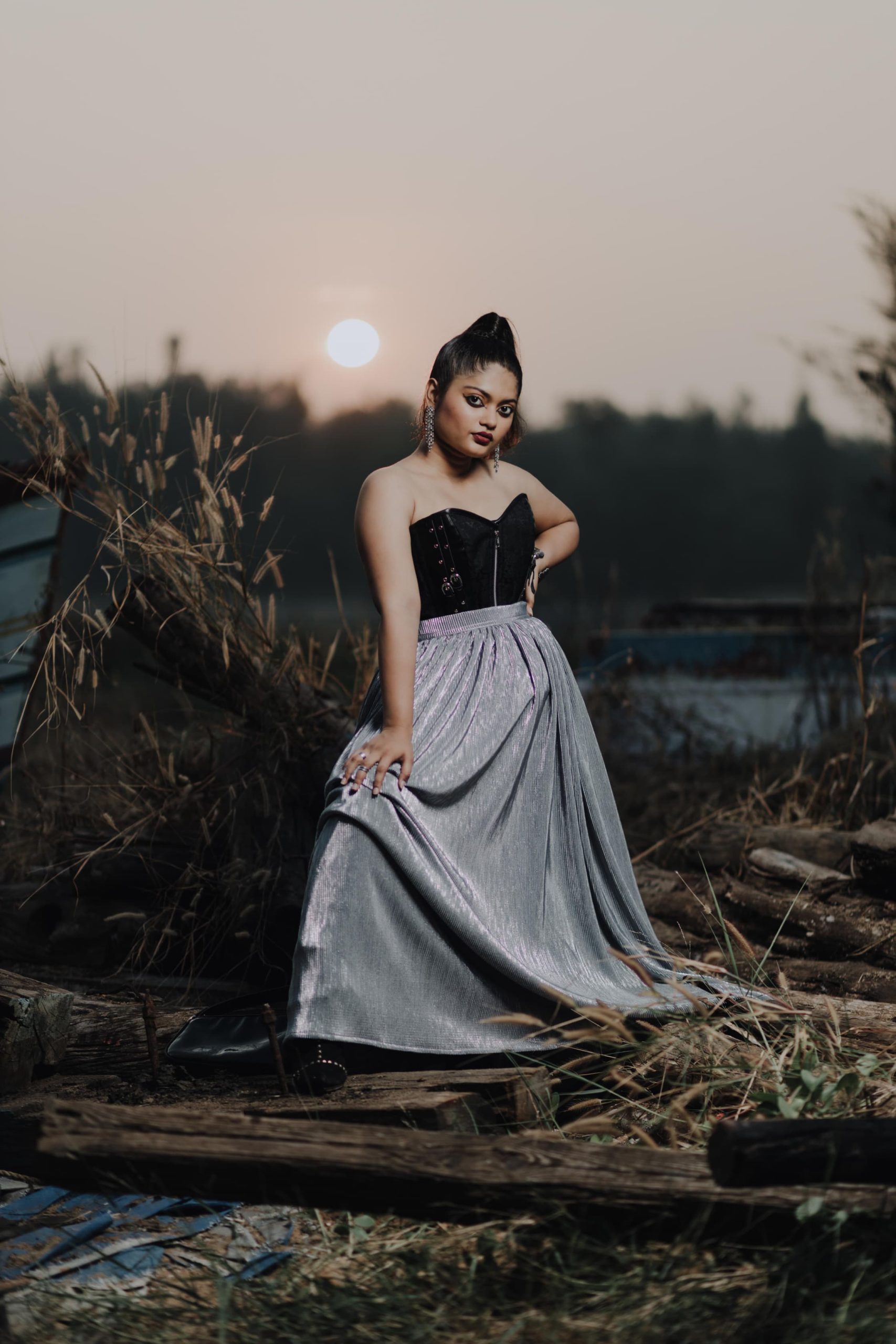 Silver colour pleated fabric lehenga with a black tube corset. This can be worn for wedding functions, shoots etc