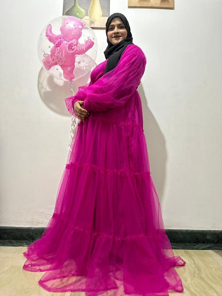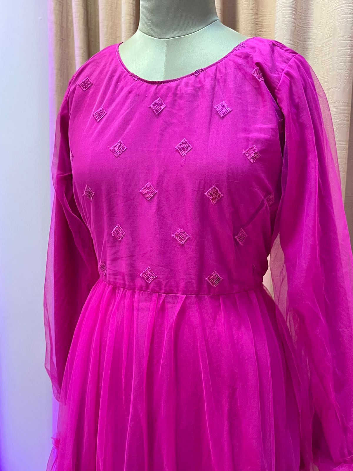 This is a gorgeous summer pink gown with Multi gathered bottom and embroidered to with long sleeves and round neck.