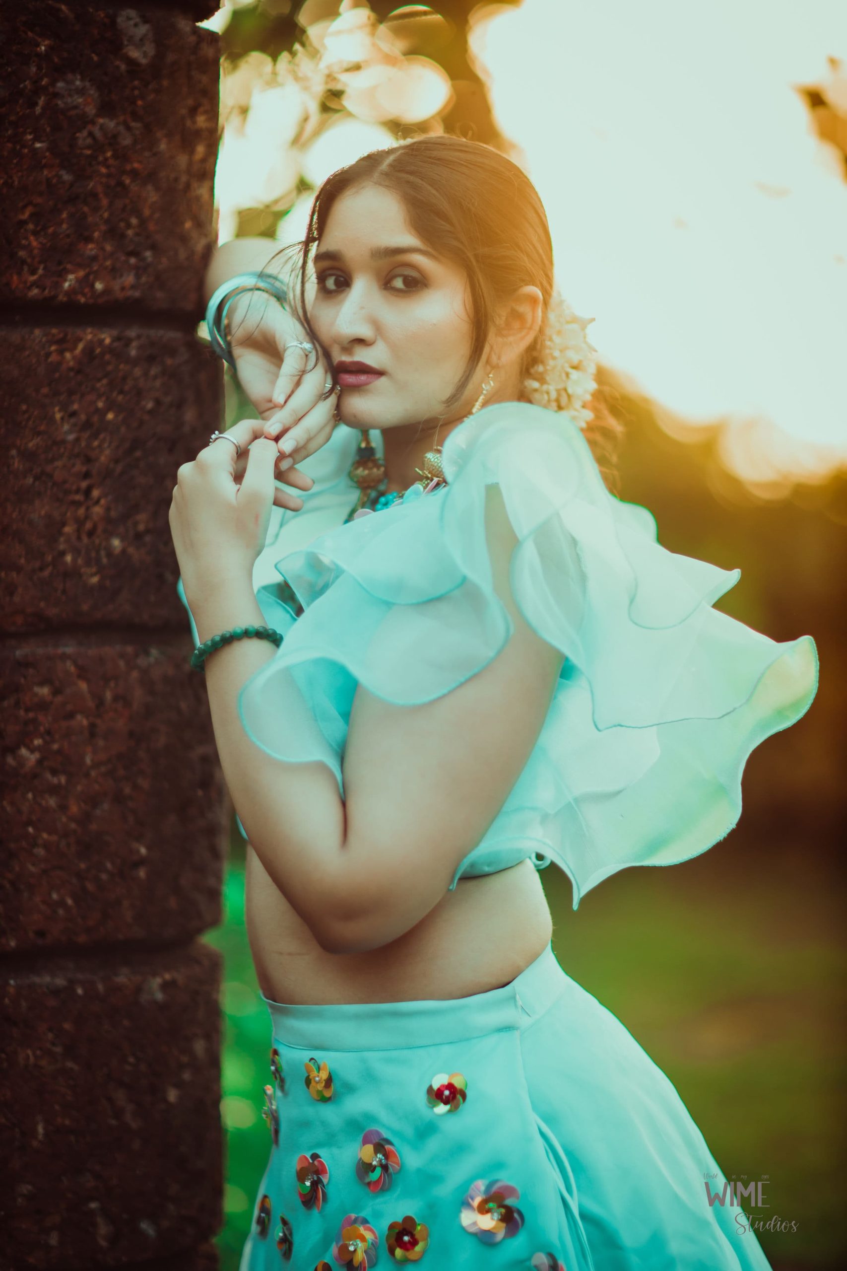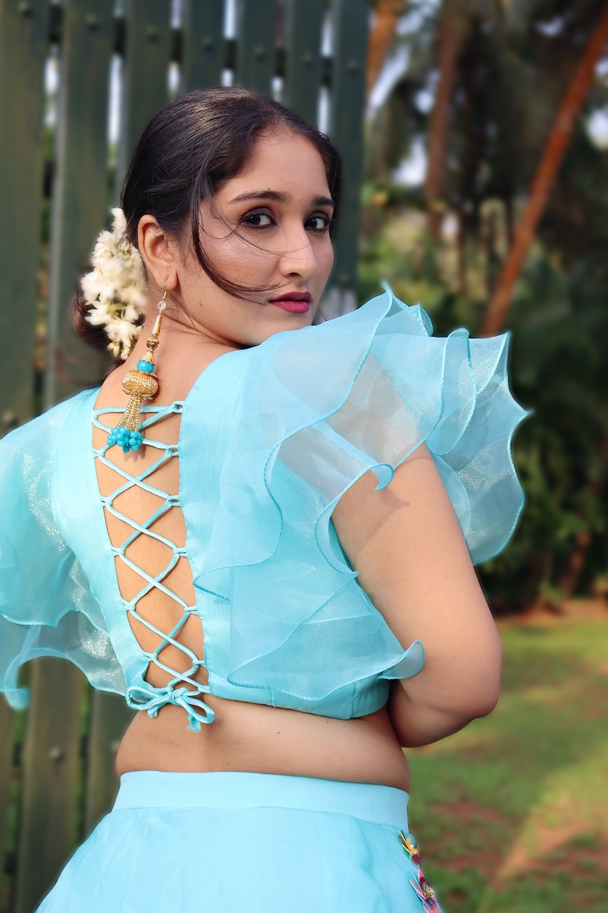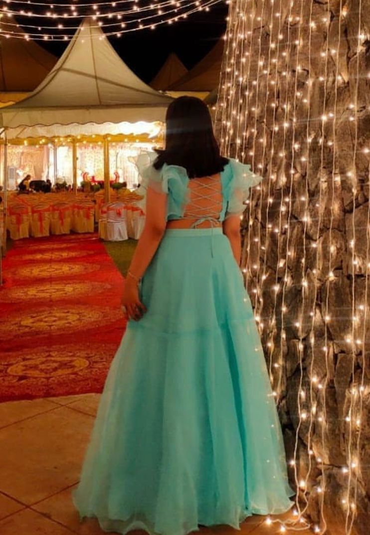 Turquoise colour organza lehenga with 3D embroidery and a umbrella sleves blouse with a beautiful neckline. This can be worn for wedding functions, shoots etc.