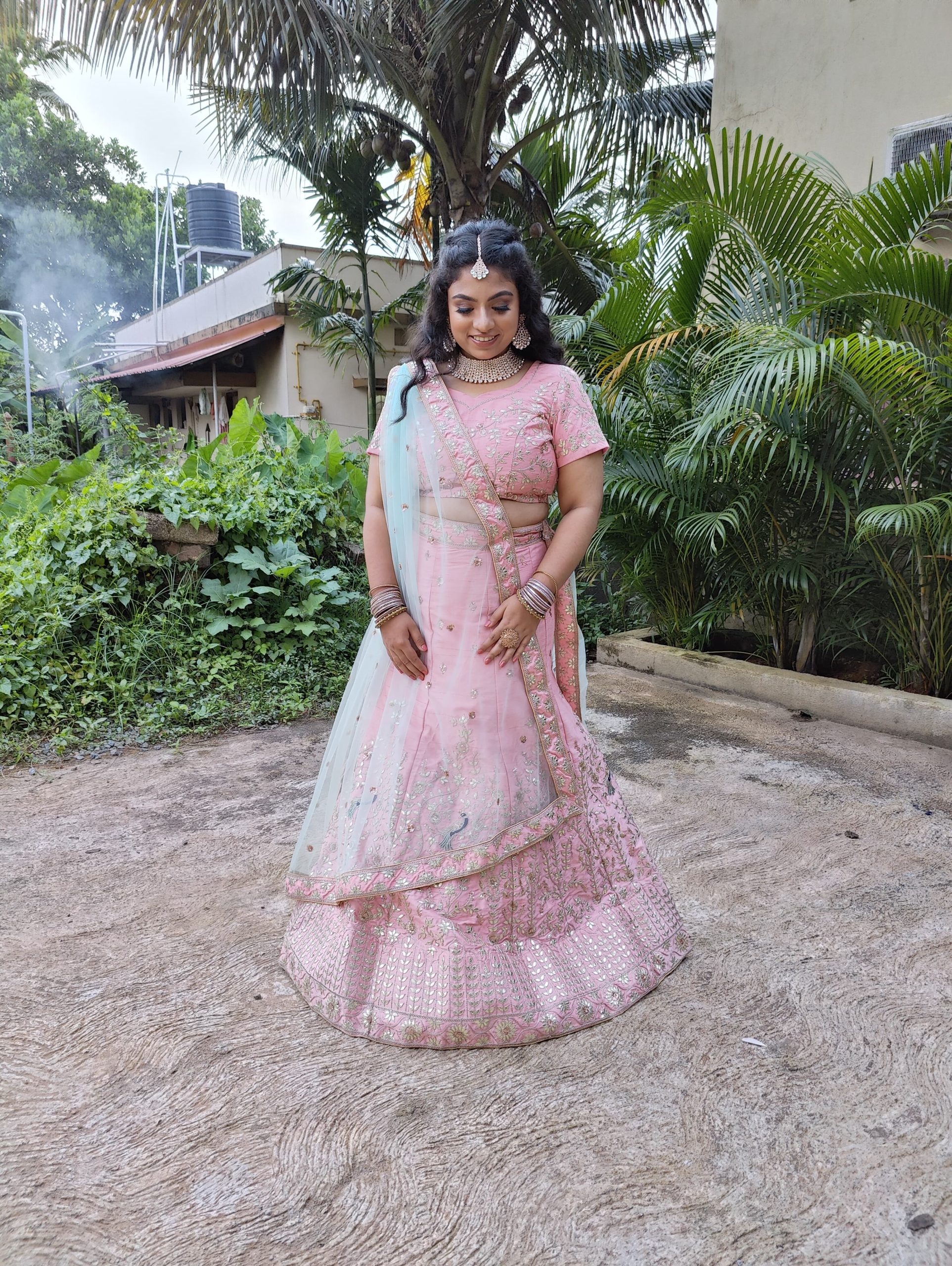 Pink Colour Bridal lehenga with beautiful floral design embroidery. This comes with 1 dupatta of baby blue colour and full embroidered blouse. It can be worn for wedding, reception, prewedding shoot etc.