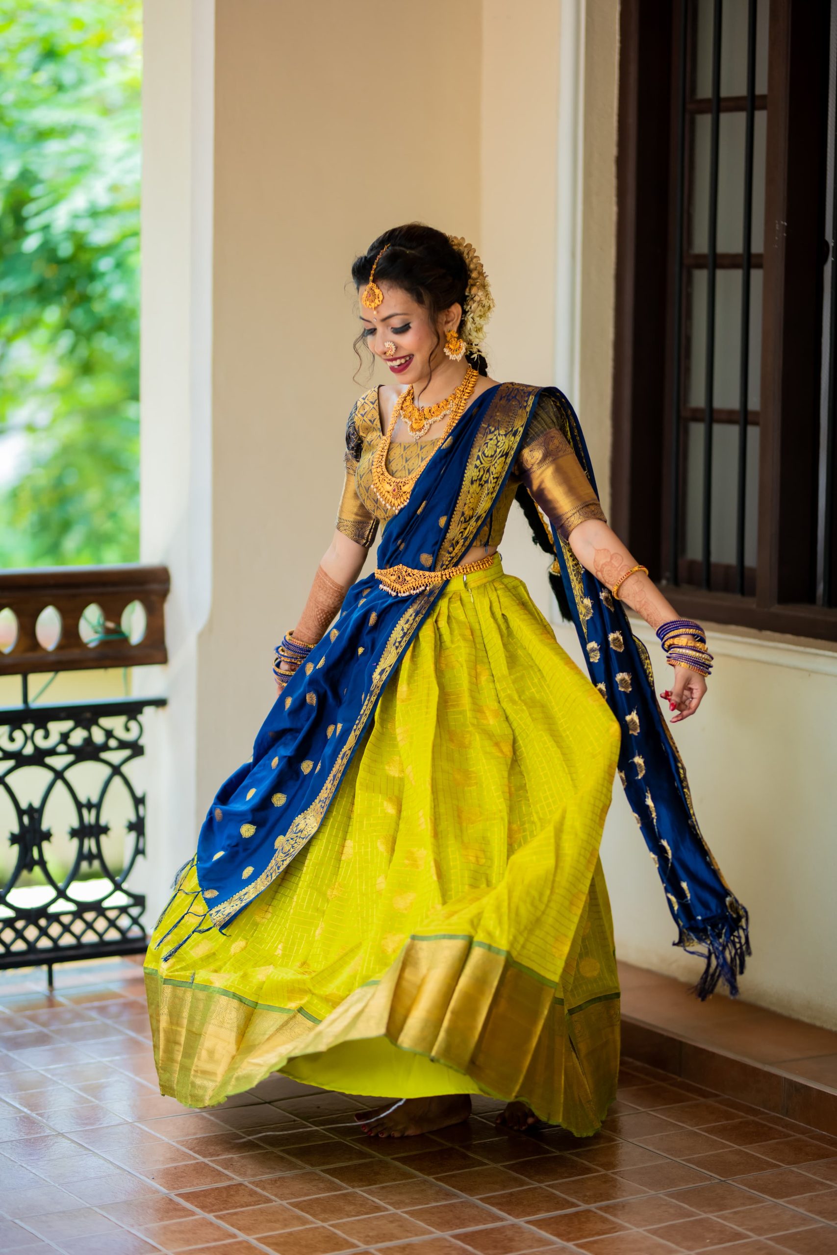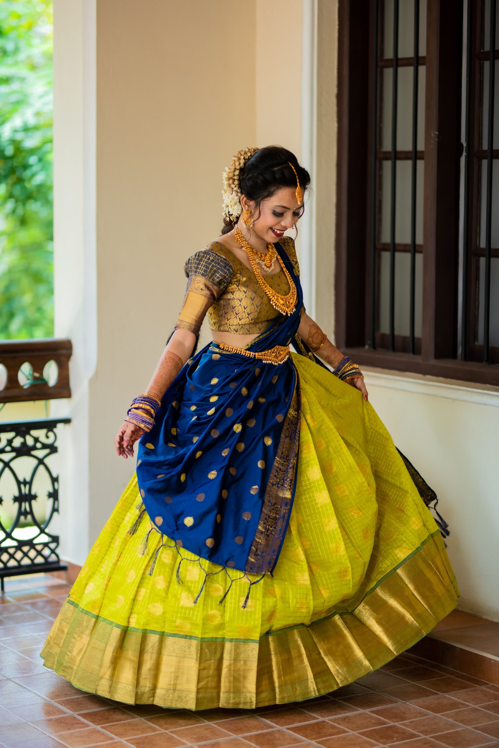 Zari silk lehenga with heavy border in green colour and a round neck blouse with puff slevves and a blue colour silk dupatta . This can be worn for wedding functions, shoots etc.